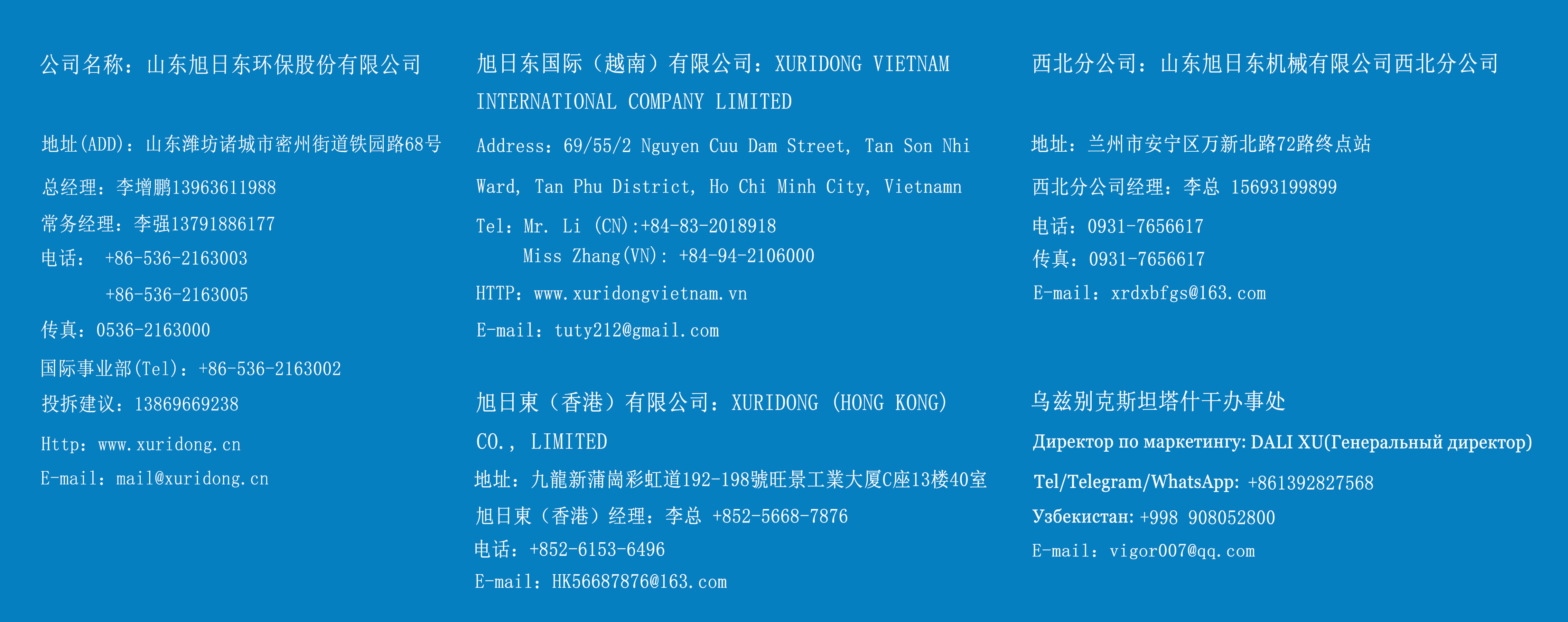 公司名称:山东旭日东环保股份有限公司 地址:潍坊诸城市密州街道铁园路68号 总经理:李增鹏 13963611988 常务经理:李强 13791886177 Tel: +86-536-2163003 +86-536-2163005 Fax:+86-536-2163000 国际事业部 Tel: +86-536-2163002 Http:www.xuridong.cn E-mail:mail@xuridong.cn